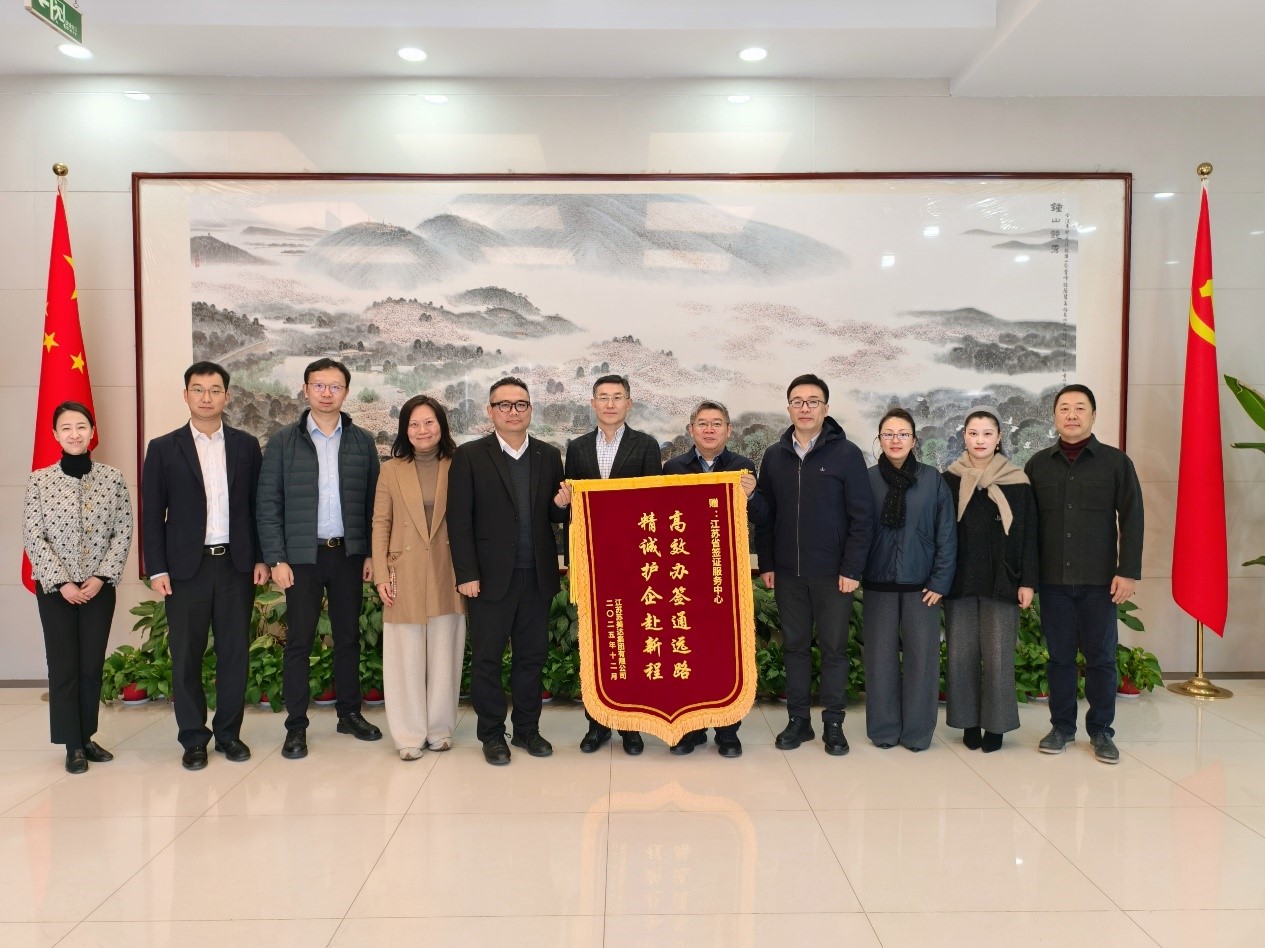 12月19日,苏美达股份有限公司党委委员、副总经理辛中华带队到访省外办,专程向省签证服务中心赠送“高效办签通远路,精诚护企赴新程”锦旗。省外办党组成员、副主任金尚军及签证服务中心相关负责人参加活动。